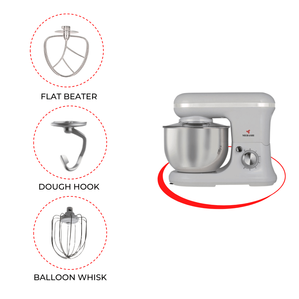 کاسه استیل ضدزنگ 5 لیتری همزن مباشی مدل ME-SBM1112، ظرفیت مناسبی برای پختهای خانوادگی و حرفهای فراهم میکند. این کاسه با طراحی چرخشی، مخلوط کردن یکنواخت را تضمین میکند و از جنس استیل ضدزنگ ساخته شده تا دوام و بهداشت را حفظ کند. لوازم جانبی شامل همزن (whisk)، همزن مخلوط (mixing beater) و قلاب خمیر (dough hook) است که هر کدام برای کاربرد خاصی بهینهسازی شدهاند.